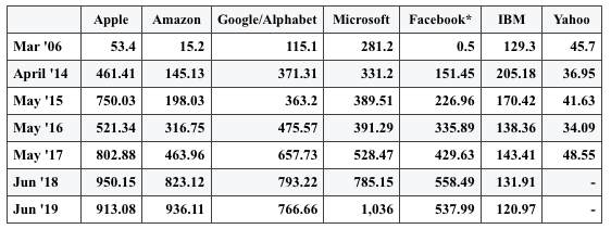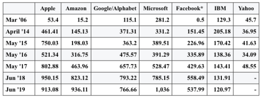 The most easily quantified dollar values (and some of the most relevant these days) are the asset values of the internet/digital stocks. The market cap is determined by the price of the stock times the number of shares outstanding. Here’s a summary: