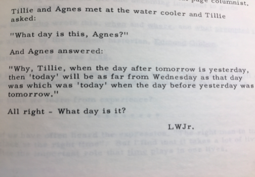 In 1957, my dad frequently included puzzles in Lou Weinberg’s PY-O-MY House Organ. Here’s one that was popular—maybe because many readers could solve it.