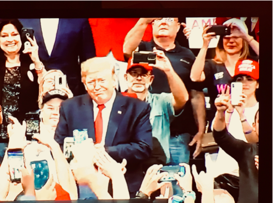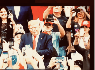 The stage is a set. The seal of the president is larger than anything else on the screen. In the background, stand a dozen or so supporters, who are carefully selected. Some are paid to be there.  Most have red hats “KEEP AMERICA GREAT.” Five African American men in white t-shirts that say “BLACK VOICES FOR TRUMP.A few women, black and white, are holding up signs behind him “WOMEN FOR TRUMP.”  They all have proof they were there on their cell phones.