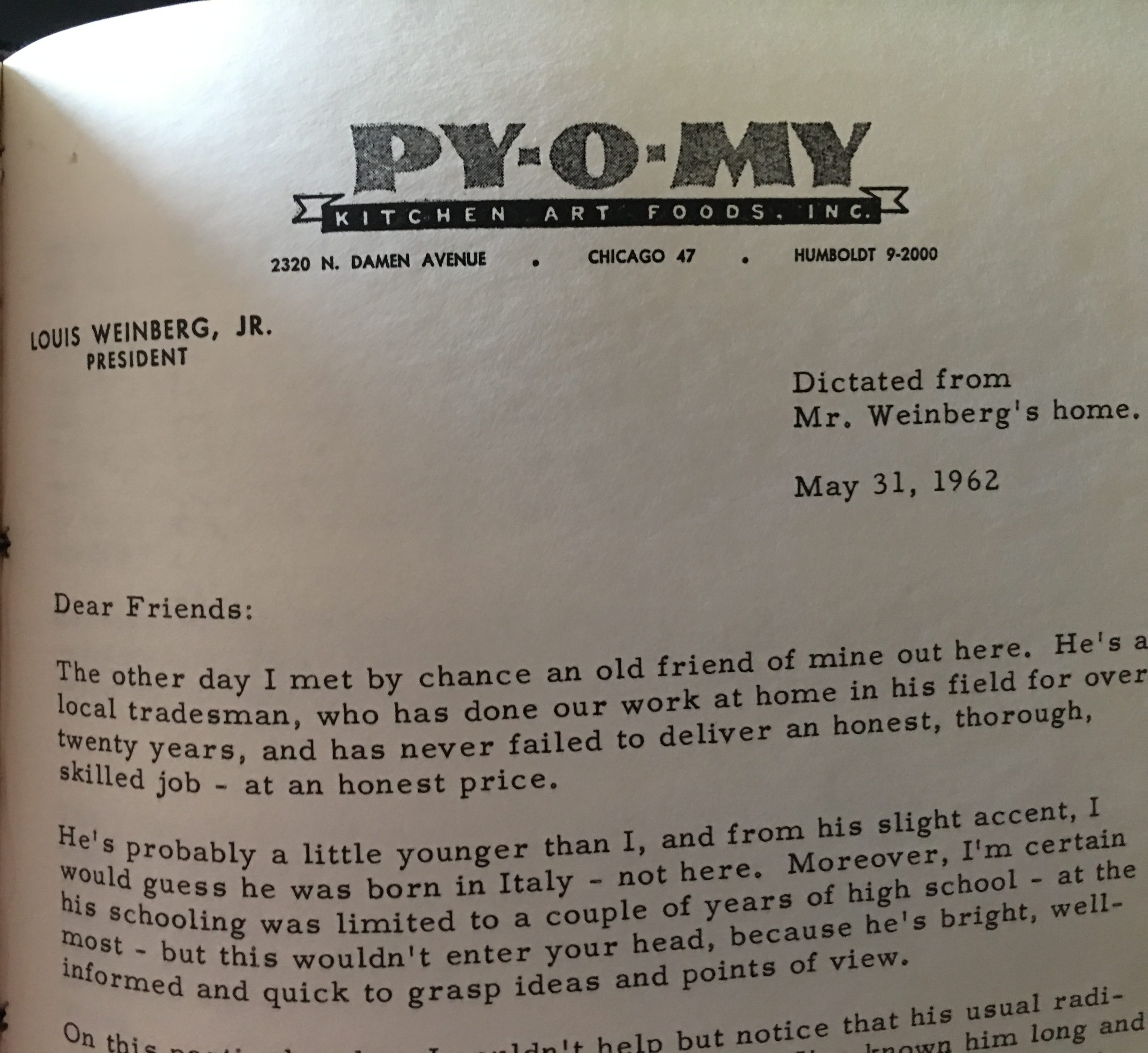 Every once in a while, I read the original Weinberg House Organ/PY-O-MY letters.  It puts me in touch with the writer, my dad, Louis Weinberg Jr., who wrote it from 1952 until his death in 1967. It’s curious to compare what it was like then with what’s happening now.  Here’s a lift from bound volume #5: