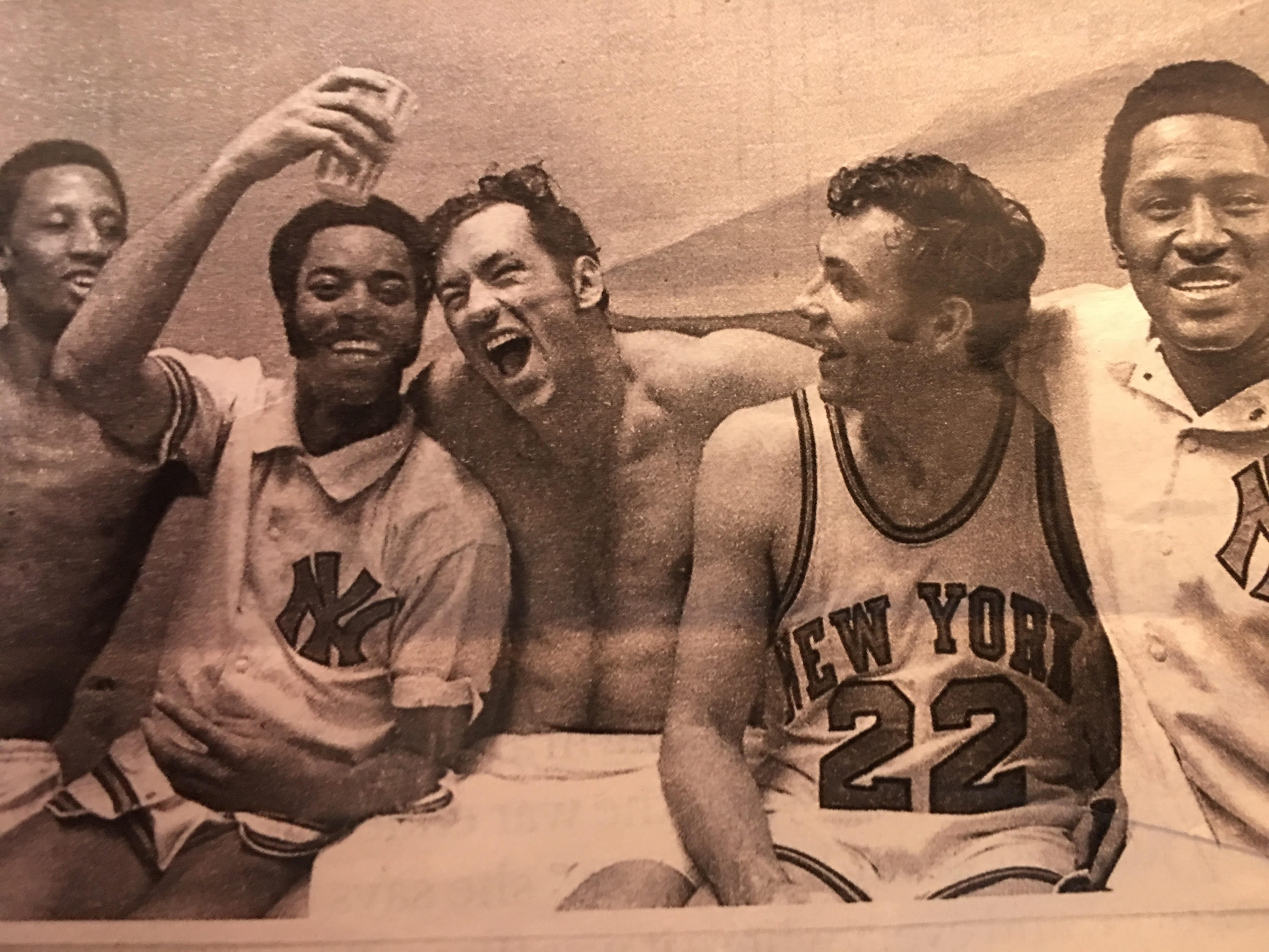 1970 NBA Champion Knicks (l to r: Dick Barnett, Walt (Clyde) Frazier, Bill Bradley, Dave DeBusschere, Willis Reed