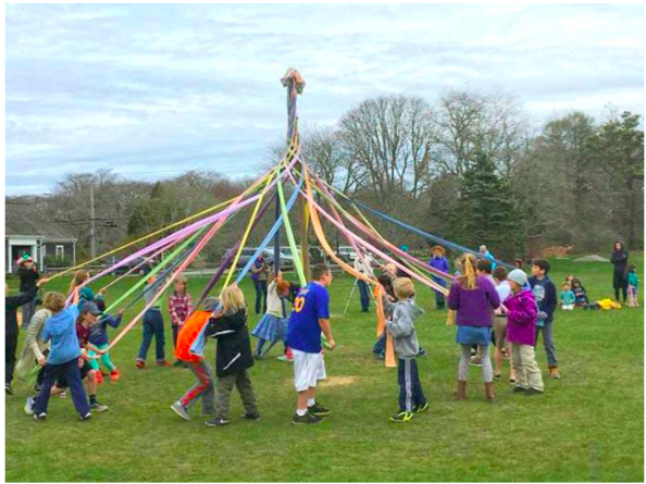 We did the Maypole with everyone in the school (about 100 of us K-5 + staff + families) grabbing hold of the long colorful strands and joyously intertwining them as we walked or skipped around the pole.
