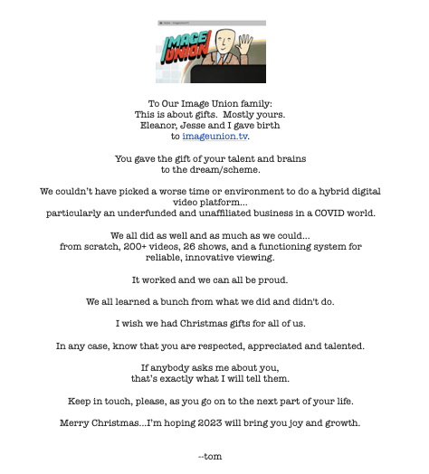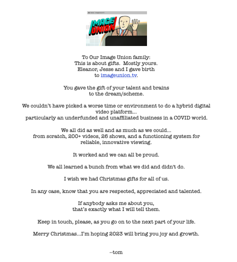 After almost two years of developing and showing imageunion.tv, we weren’t able to build enough audience to get enough revenues to cover our relatively small costs. We folded up the tent in December. Here’s the email we wrote to our dozen or so collaborators:
